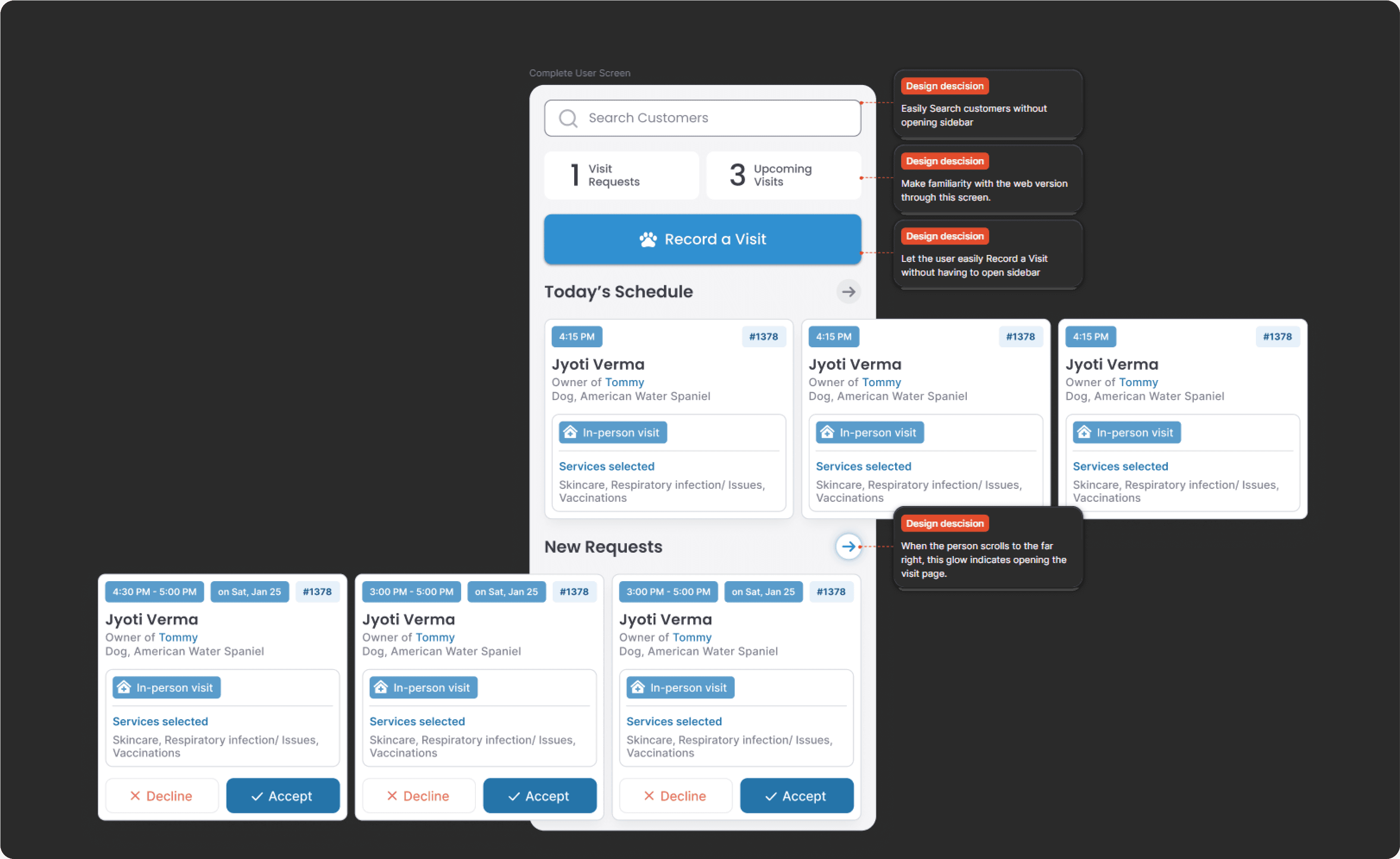 Designing End-to-end application. Core users being Pet owners and Pet doctors. With the design research already done, my work was to design application for both user segments.